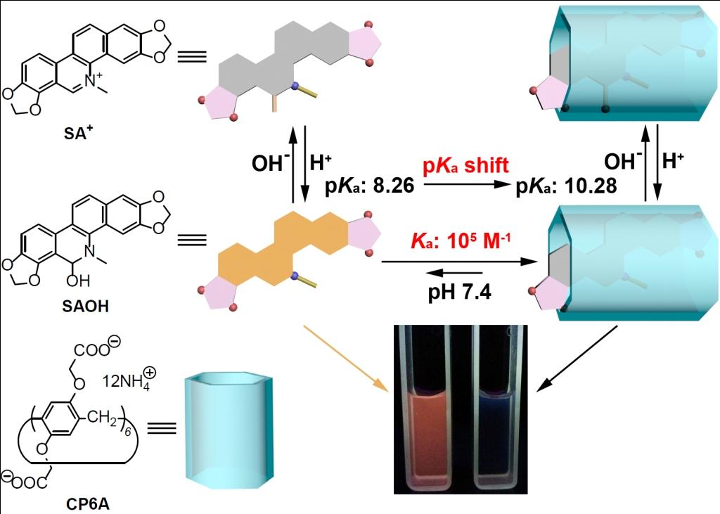 血根碱是存在于白屈菜、博落回和血水草等多种植物药材中的活性生物碱成分,具有抗菌、杀虫、抗肿瘤和改善肝功能等药理活性。但它的水溶性较差,而且在生理pH值下存在两种形式,也就是具有生理活性的阳离子(iminium)结构和不具有活性的中性分子结构(alkanolamine),这些缺点一定程度上限制了它的生物医药应用。化学系本科生科创团队所设计的大环•药物包结络合体系提供了一种通过调控药物分子pKa来改善药物活性的有效策略。水溶性主体对血根碱的强络合识别作用不仅使药物的溶解性增加了4.3倍,还能够增强其抗菌活性,这是由于药物分子被包结后的pKa增加了2.02,使得更多分子处于具有生理活性的阳离子形式。