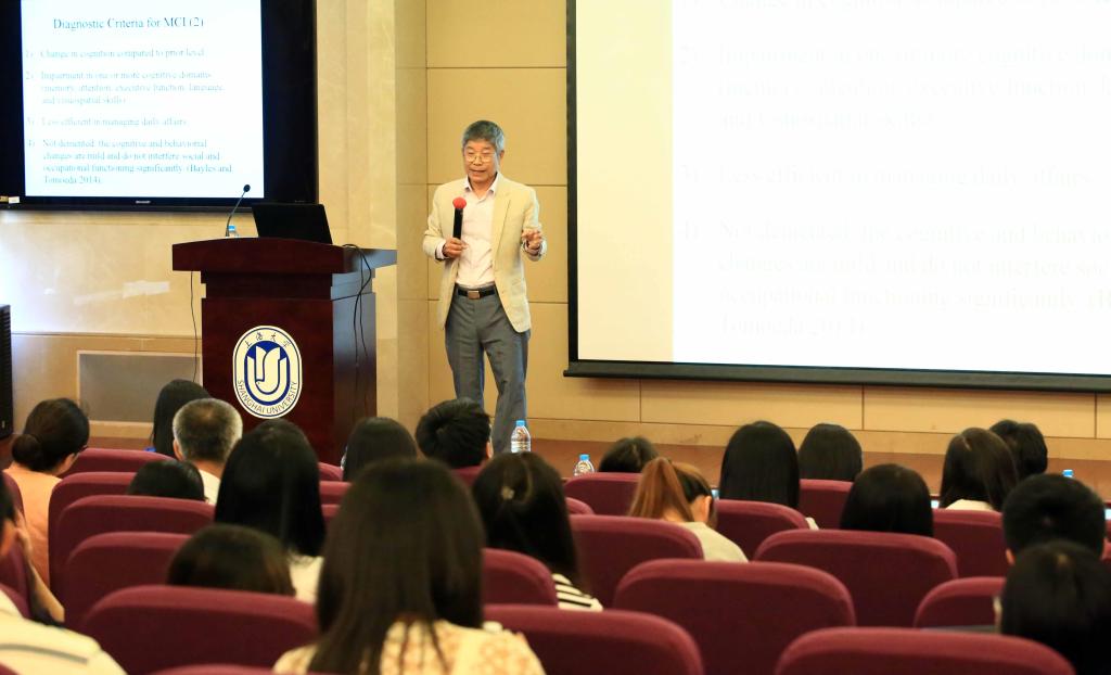 5月25日下午,上海大学“海外高端专家引智专项”2017年国际大师讲坛之(四)在宝山校区乐乎新楼学海厅成功举行。本次讲座邀请到台湾语言学学会“终身成就奖”获得者、台湾中正大学讲席教授、国际顶级认知语言学家Tai, James Hau-Y(戴浩一)教授,为全校师生奉献了一场“老龄化社会年长者的认知与语言储备”( Cognition and Language Reserve of the Elderly in an Aging Society)的精彩讲座。讲座由上海大学国际事务处倪兰副处长主持,吸引了来自校内外的师生近百人前来参加。