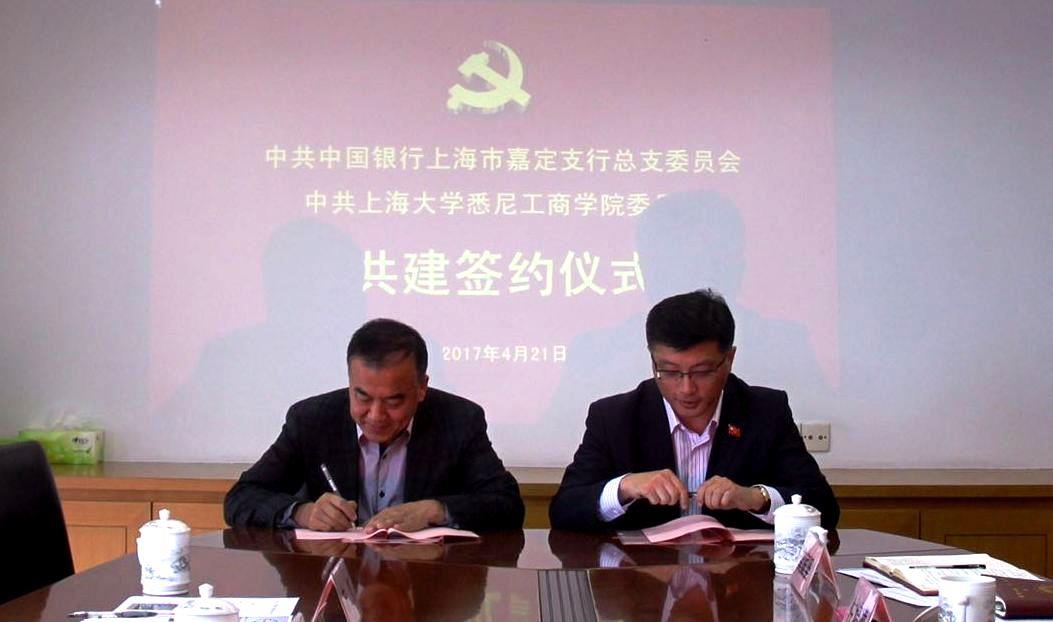 为创新基层党建工作载体,提高基层党建工作水平,按照中共上海市嘉定区委、上海大学党委关于进一步发挥地区与高校优势,加强合作,促进嘉定和上海大学共同发展的精神和要求,经前期沟通协商,悉尼工商学院党委与中国银行嘉定支行党总支实现党建、精神文明共建结对。4月21日上午,共建签约仪式在中行嘉定支行举行。行长兼总支书记仇一尘、副行长兼总支副书记施晓瑾等出席会议,学院党委书记李双、副书记卫静芬、副院长方慧等前往参加会议。