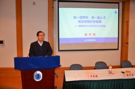 会上,理学院党委书记盛万成代表学院做了题为《创一流学科,育一流人才,推动学院科学发展》的行政工作报告以及财务工作报告。报告从拓宽学科视野,凝练学科发展内涵;坚持创新驱动,提高教育教学质量;激活师生能动性,提升文化育人品质等三大方面全面总结了学院一年来的主要工作,提出了学院遇到的瓶颈与问题、下一步的努力方向与措施。盛万成在报告中指出,学院取得的一些进步和成绩,离不开广大教职员工的辛勤付出和共同努力,在学校高水平大学建设过程中,理学院作为试点学院之一,任务艰巨,责任重大,学院上下要进一步解放思想,统一认识,明确目标,以高度的责任感和使命感,把压力转变成推进工作的强大动力,务实做好2017年各项工作,推动理学院工作上一个新台阶。