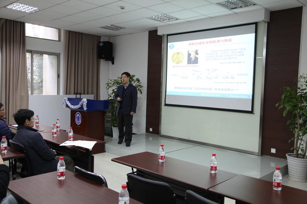 3月16日下午, 华中师范大学化学学院肖文精院长在上海大学校本部HA楼102报告厅为我校师生作了一场题为"杂环合成中的串联反应策略"的学术报告,该报告是理学院当代科学前沿讲坛第235讲。 肖文精教授的学术报告内容非常丰富,涉及到[4+1]环化/重排串联反应、[4+1]/[3+2]环加成串联反应、Michael加成/N-烷基化串联反应。通过这些反应,可以从简单易得的原料出发来简洁地合成一系列多元杂环化合物。另外,通过学习并模仿自然界的光合作用策略,成功地发展了可见光促进的串联反应,并以此作为关键步骤,实现了一些具有生物活性的杂环化合物的光氧化还原构建。与会者对于肖文精教授的报告很感兴趣,报告一结束,与会教师和同学就争先恐后地提出有关报告的学术问题,肖文精教授对大家的问题都一一详尽地做了解答。场上气氛甚是热烈。会后,与会者对肖文精教授的精彩报告给予了热烈的掌声。