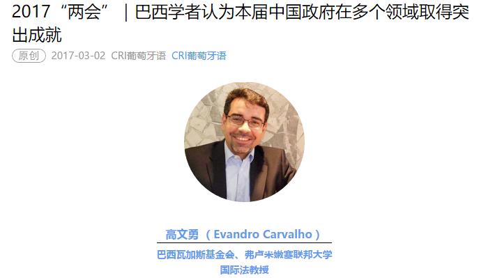 2017年“两会”召开前,我校高端外专Evandro Menezes de Carvalho(中文名:高文勇)接受了国际在线(CRI Online)及新华网的专访。