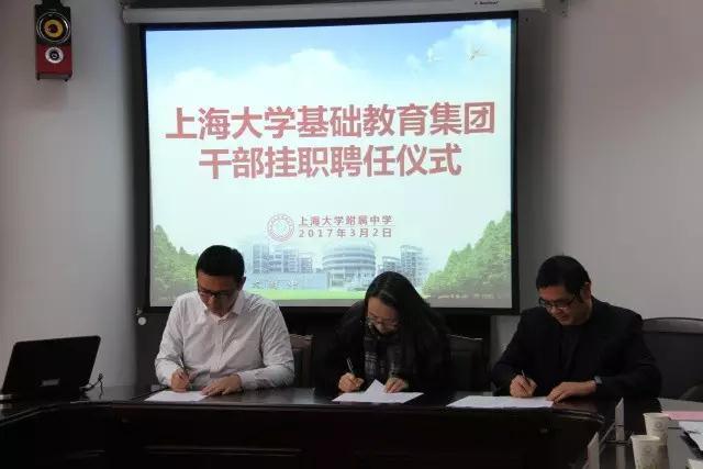 为了推动上海大学基础教育集团的建设和发展,上海大学选派优秀年轻干部到上大附中挂职,近日,上海大学基础教育集团干部挂职聘任仪式在上大附中举行。上海大学组织人事部副部长王军华、张洁、张英姿,上大附中党政领导班子及各职能部门负责人出席了聘任仪式。