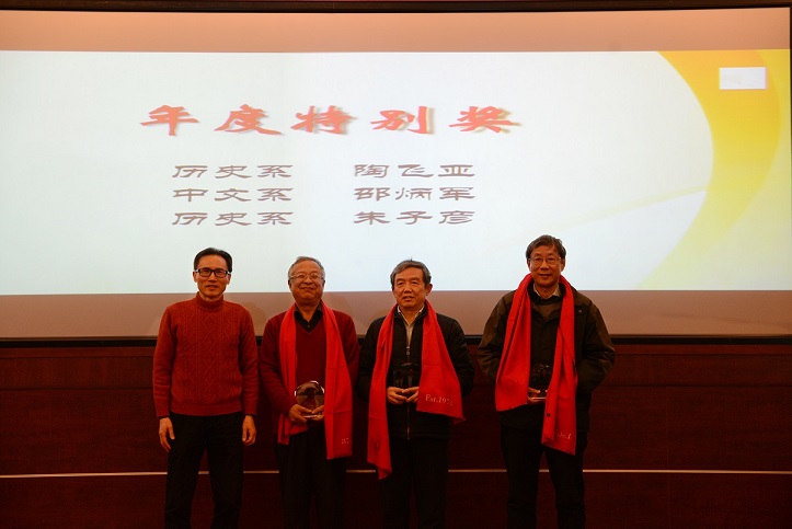 在优秀表彰环节,中文系葛红兵教授获得“教学贡献奖”;文化研究系闵冬潮教授、中文系孙晓忠教授、历史系宁镇疆教授、王三义教授获得“科研贡献奖”;中文系李海霞、凌峰副教授获得“英才培养奖”;历史系刘义副教授获得“青年才俊”奖;历史系郭长刚教授、中文系曾军教授、院工会主席赵益民获得“突出贡献奖”;中文系邵炳军教授、历史系陶飞亚教授、朱子彦获得“年度特别奖”。会议为今年光荣退休的中文系黄建华老师、院办李德山老师举行了荣休仪式。
