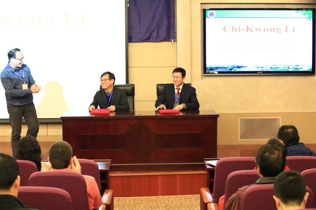 12月29日下午, 上海大学张量与矩阵理论国际研究中心 (IRCTMT)与韩国成均馆大学应用代数与优化研究中心 (AORC)合作备忘录签署仪式在上海大学乐乎新楼海纳厅举行。仪式由上海大学数学系林明华博士主持,IRCTMT 学术联合主席 、美国威廉玛丽学院的Chi-Kwong Li教授致欢迎辞。上海大学数学系主任、IRCTMT主任王卿文教授与韩国成均馆大学应用代数与优化研究中心主任Gi-Sang Cheon教授分别代表双方签署了合作备忘录。我校IRCTMT的若干核心研究成员与成均馆大学AORC的九名代表共同参加了签署仪式。