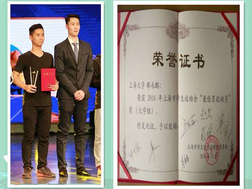 在本次颁奖典礼上,上海大学获得荣誉有:校长杯奖、体育道德风尚奖、最佳教练员提名奖(陈琳)、最佳男运动员奖(郁永鹏)、最佳优秀社团提名等奖项。