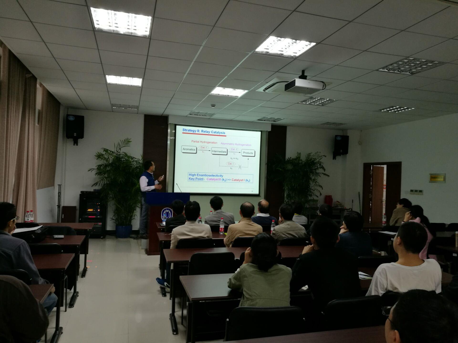 10月27日,中国科学院大连化学物理研究所周永贵研究员应邀到上海大学理学院化学系进行学术交流,并作题为“芳香杂环化合物不对称氢化”的学术报告。该报告为理学院“当代科学前沿讲坛”第232讲,报告由化学系吴小余教授主持。系党总支书记陈雅丽教授、曹卫国教授、贾学顺教授、李健教授、蒋海珍教授等40余名化学系师生参加本次学术活动。 周永贵研究员1999年在中国科学院上海有机化学研究所获得博士学位,之后在美国宾州州立大学从事博士后研究,2002回到中国科学院大连化学物理研究所开展独立研究工作至今。现任大连化物所研究员、博士生导师、手性合成研究组组长、精细化工研究室室主任。目前的研究领域为均相不对称催化,主要开展了芳香杂环化合物的不对称氢化研究,通过发展底物活化、催化剂活化和仿生接力催化策略,成功实现了芳香杂环化合物喹啉、异喹啉、吡啶、简单吲哚、简单吡咯和喹喔啉等的不对称氢化。在 Chem. Rev., Chem. Soc. Rev., Acc. Chem. Res., J. Am. Chem. Soc., Angew. Chem. Int. Ed.等刊物上发表研究论文发表研究论文130余篇。2006年获得 Thieme Chemistry 杂志社的 Journals Award 2006,2011年获国家自然科学杰出青年基金,2012年获首届“中国化学会青年手性化学奖”,2014年获得中青年科技创新领军人才称号。 在报告中,周永贵研究员介绍了其研究团队近年来在芳香杂环化合物的不对称氢化、仿生不对称氢化和基于重排反应的不对称氢化等方面的工作进展。他们通过发展催化剂活化、底物活化和两种催化剂接力催化等策略,成功实现了芳香杂环化合物喹啉、异喹啉、喹喔啉、吡咯、吡啶和吲哚等的不对称氢化。综合利用以上催化策略,成功发展基于辅酶NAD(P)H以氢气为最终氢源的仿生催化不对称氢化体系。此外,利用芳香杂环化合物不对称氢化作为关键步骤,成功实现一些手性药物和天然产物被快速合成。与会师生和周永贵研究员进行了积极的互动和交流,周永贵研究员热情认真地回答了师生提出的问题。