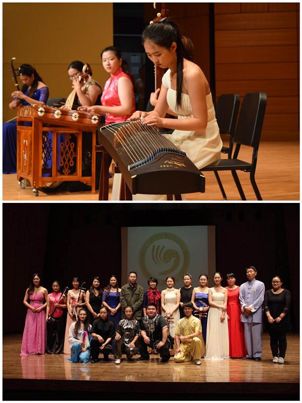 今年是肯大孔子学院成立五周年,作为庆典活动的一部分,上大音乐学院民乐小组的演出自然受到了广泛的关注。为了保证演出质量,演出队在3日的校园参观结束后,迅速投入紧张的排练。晚上的音乐会在艺术学院的音乐厅举行,修华静博士在简短的演讲后介绍了来访的上大师生。音乐会由一系列民乐作品组成,其中穿插了上大体育学院的二个武术节目。虽然演出当天晚上在肯大体育场举行着在美国极具人气的大学生橄榄球联盟比赛,但这几乎没有影响音乐厅的上座率。民乐组充满激情的演出引来一阵阵热情的欢呼,肯大师生为来自中国的充满东方色彩的音乐和情感报以热烈的掌声。演出结束后,许多观众走上舞台,他们触摸着来自东方的神秘的乐器,激动地表达着内心的感受,与上大师生进行面对面的热切交流,久久不愿离去,其场面十分感人……