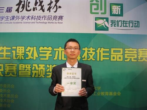 6月2日,第十三届挑战杯上海市大学生课外学术科技作品竞赛终审决赛和颁奖典礼在上海师范大学隆重举行。理学院化学系09级应用化学专业的马俊伟同学以一篇自然科学类论文《水溶性柱[5]芳烃对碱性氨基酸的选择性键合研究》荣获挑战杯上海市大学生课外学术科技作品竞赛一等奖。 “挑战杯”竞赛是由共青团中央、中国科协、教育部、全国学联和地方政府共同主办的一项具有导向性、示范性和群众性的全国竞赛活动,被誉为当代大学生科技创新的“奥林匹克”盛会。挑战杯已成为国内规模最大、规格最高、影响范围最广的综合性学生科技创新赛事。上海市挑战杯大学生课外学术科技作品竞赛同时是全国挑战杯的市级选拔赛,本届市级竞赛共有27所高校102个项目入围终审决赛,第一次以布展答辩方式进行决赛评审,并根据各高校作品团体总分情况颁发挑战杯1座及优胜杯8座。上海大学此次选送的经过校级层层选拔的12件作品,最终有8件入围市赛决赛,我校以高校团体总分第二的成绩力捧优胜杯,并将有6件参加全国挑战杯赛。 马俊伟同学从大二开始进入化学实验室,表现出极大的科研热情。他曾主持一项上海市大学生创新项目,参与一项国家级大学生创新项目。在化学系李春举老师的指导下从事超分子化学的研究,取得了可喜成果,已在Org.Lett、Chem.Commun等杂志发表学术论文各一篇,此外还发表了一篇全国会议论文,申请一项国家发明专利。此次参赛的作品以学生第一作者发表在今年3月出版的Chem.Commun (影响因子6.169)杂志上,据不完全统计,发表至今已被引用6次以上。 目前马俊伟的项目已进入国赛阶段,我们相信马俊伟会再接再厉,预祝其再创佳绩。