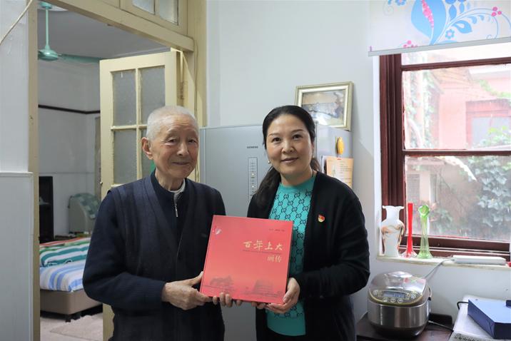 招毕办党支部书记、主任陆瑾为潘老一家送上了《百年上大画传》及上海大学上海美术学院苏金成老师的书法作品,表达了师生们的美好祝福与崇高敬意。