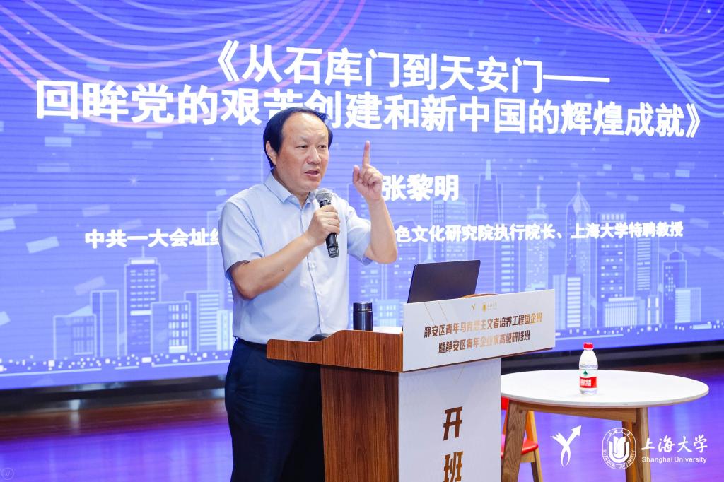 研修班首讲课程由中共一大会址纪念馆原馆长、上海红色文化研究院执行院长、上海大学特聘教授张黎明为学员讲授:《从石库门到天安门——回眸党的艰苦创建和新中国的辉煌成就》。通过回顾党的艰苦创建历史和新中国发展史,引导广大青年树立正确人生观、价值观,为实现民族复兴、人民幸福的美好愿景而努力奋斗。