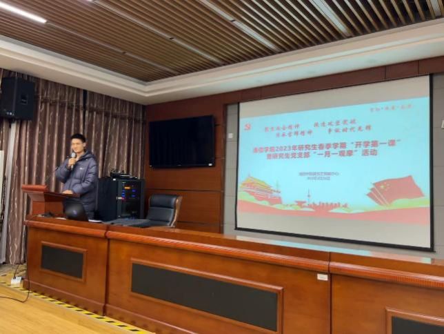 接下来,2022级研究生第三党支部书记贺建宇同志带领研究生党员和入党积极分子共同学习了两会精神和雷锋精神。首先,贺建宇对今年全国两会的报道进行了总结概括,呼吁新时代青年党员要以高度的责任感和历史使命感,积极投身改革创新和经济建设,勇于担当、敢于作为,为实现全面建设社会主义现代化国家的宏伟目标贡献青春力量。其次,贺建宇还带领大家深入学习了雷锋精神的具体内涵和当代价值,号召广大党员要积极参与志愿服务和社会公益活动,树立崇高理想追求,践行社会主义核心价值观,投身中国式现代化建设,为推动学雷锋思想常态化、长效化贡献青春力量。