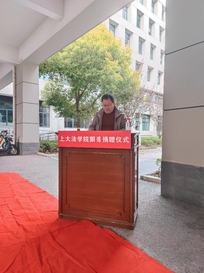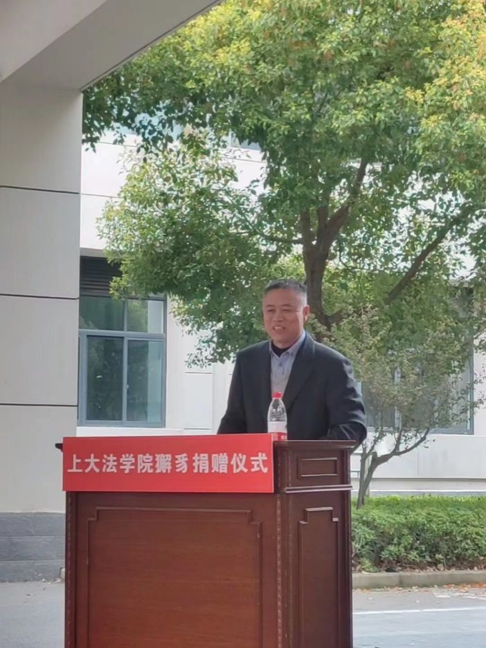 法学院院长李凤章代表上海大学法学院致感谢辞。李凤章院长向河北龙凤山铸业有限公司各位嘉宾的到来表示热烈的欢迎和诚挚的问候,向长期以来一直关心和支持学院发展的企业致以由衷的感谢和崇高的敬意。李凤章从法学院与钢铁铸业的缘分出发,介绍了獬豸作为中国传统的司法神兽,能“见不直者触,辨是非”,其所代表的法律廉洁公正、执法不阿的精神与上海大学法学院“维礼尚法,恪正克艰”的院训非常契合,昭示着学院将尽心竭力地为社会培育法治英才,激励着法学教育工作者矢志不渝地坚守法治初心,鞭策着法学学子坚定不移地捍卫公平正义。河北龙凤山铸业有限公司向法学院捐赠獬豸雕塑,不仅体现了公司对法学教育的支持,也体现着对法治中国建设的贡献。上海大学法学院一定牢记信任和嘱托,做好人才培养和科学研究,为中国的法治事业建设贡献力量。