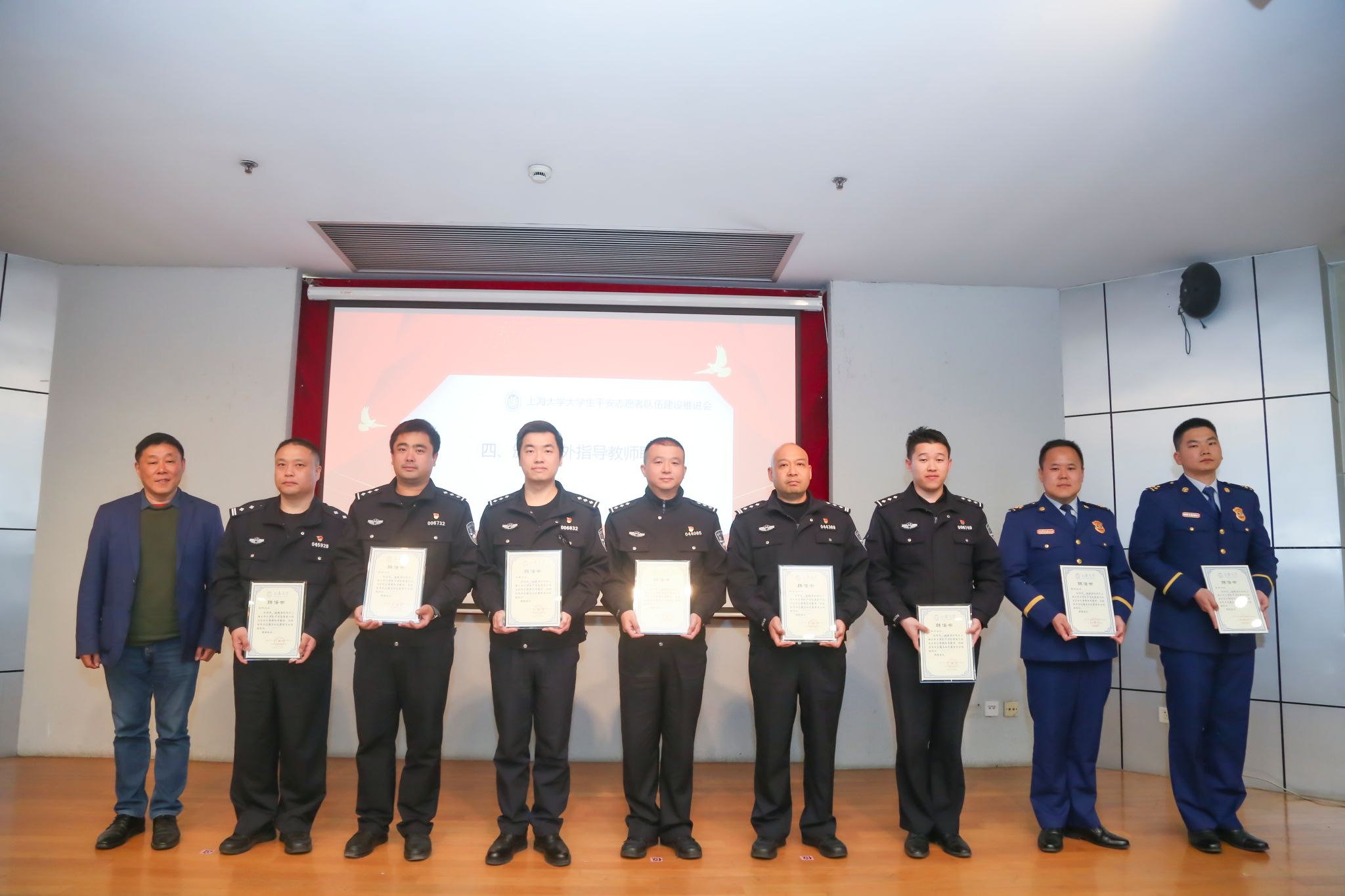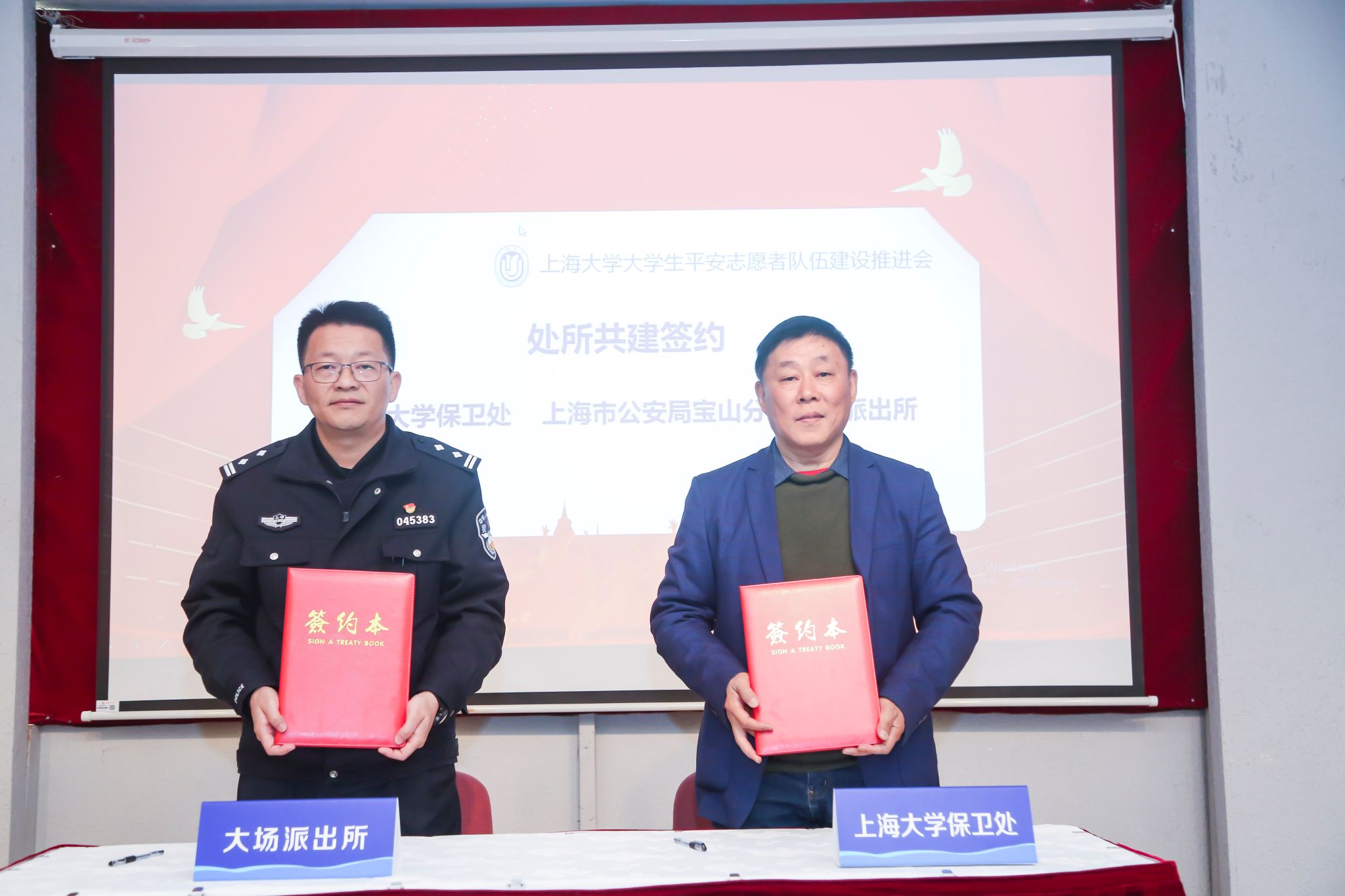 会上,上海大学保卫处处长沈龙骥分别与上海市公安局文保分局沪东高校派出所所长胡军、宝山分局祁连派出所所长谢国卫、大场派出所所长林建军代表双方签订《处所共建协议书》,共同开展安全育人工作,指导上海大学大学生平安志愿者队伍建设,通过安全培训教育、共建“平安屋”工作,提高大学生安全意识和能力,推进平安校园建设。沈龙骥还为上海市公安局宝山交警支队副支队长顾伟、文保分局治安大队副大队长谢晔、沪东高校派出所副所长王韡、警长陆英杰、宝山分局祁连派出所副所长姚波、大场派出所副所长沈开运、宝山区大场消防救援站党支部书记、政治指导员陈鸣、黄浦区复兴消防救援站副站长朱豪颁发了上海大学大学生平安志愿者行动支队校外指导教师聘书。会上还进行了上海大学大学生平安志愿者行动支队工作总结与规划汇报,悉尼工商学院、材料科学与工程学院作为分队代表、社区学院张起豪同学和理学院陈天放同学作为平安志愿者代表分享交流,通信与信息工程学院作为分队代表接受了授旗,“反诈骗、促平安”创意大赛优秀作品《校园防电信诈骗之307疑云》展播与大赛颁奖。