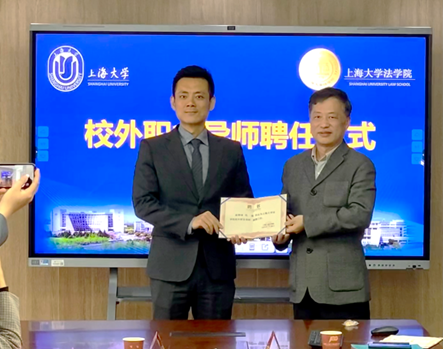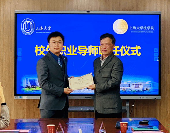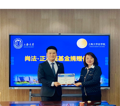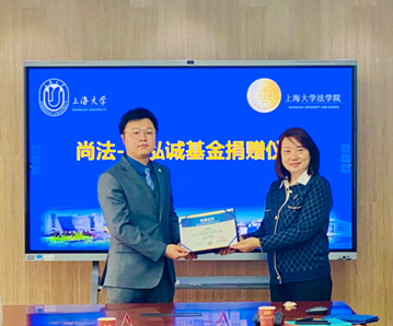沈诚、黄正桥和金泓毅三位律师向上海大学法学院捐赠设立“尚法·正泓诚基金”,上海大学对外联络处副处长、校友会办公室副主任杨静为捐赠人颁发捐赠证书。