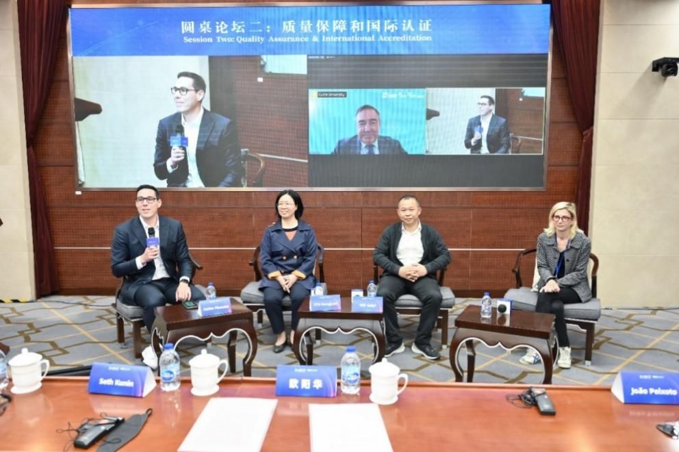 圆桌交流环节,在上海大学里斯本学院葡方副院长Pedro Manuel Girao教授和上海大学中欧工程技术学院法方院长Fabien Pfaender教授的主持下,科廷大学新加坡校区校长Linley Lord教授,上海交通大学交大密西根联合学院副院长郑刚和同济大学中德学院副院长蔡黎明围绕“涉外办学治理”分别就全球校区管理带来的机遇和挑战,如何进行科教协同的国际化人才培养等陈述观点并进行讨论; 在第二环节“质量保障和国际认证”部分,上海大学悉尼工商学院党委书记吕康娟、浙江工商大学萨塞克斯人工智能学院院长魏贵义和上海大学中欧工程技术学院副院长Laure Minassian教授分别就如何以质量认证为抓手提升涉外办学质量,如何培养国际卓越工程师等进行了分享和讨论。