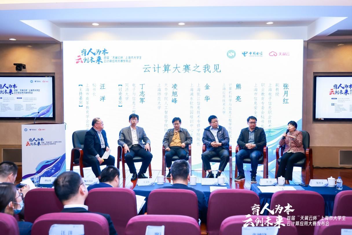 技术交流环节,由上海市高等教育学会信息管理专业委员会主任委员沈富可主持。上海大学计算机学院副院长李晓强以“云计算人才培养的思考与探索”为题进行演讲,天翼云专家薛真以“天翼云助力教育数智化‘展翅飞翔’”为题进行演讲。最后,嘉宾围绕“云计算创新发展”、“云计算大赛之我见”主题进行了圆桌讨论。