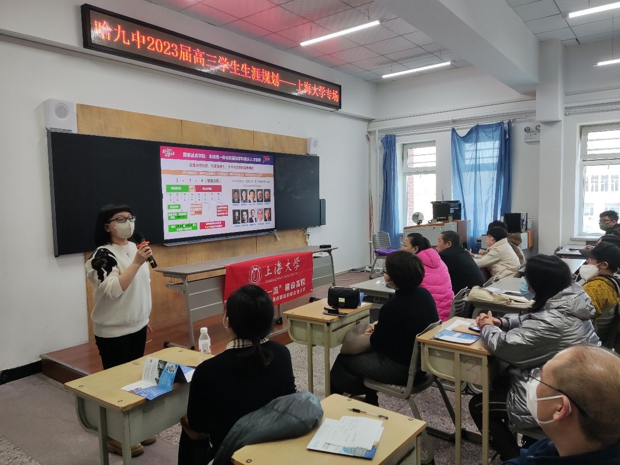 3月4日上午,招生与毕业生就业工作办公室副主任卢欣为哈尔滨市第九中学的考生家长们详细介绍上海大学的办学历史、师资力量、专业设置、优势学科、人才培养特色、以及上海大学在黑龙江的招生政策等情况,钱伟长学院黑龙江招宣专员阮杜娟为家长介绍钱伟长学院招生政策,现场气氛热烈,考生家长踊跃提问。