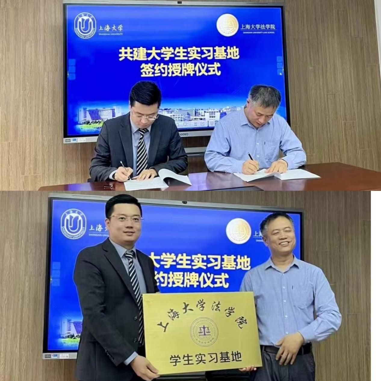 在法学院学生实习基地签约授牌仪式中,李凤章院长和张志超主任分别代表上海大学法学院和上海铸达律师事务所签署协议,并授予“上海大学法学院学生实习基地”铜牌。