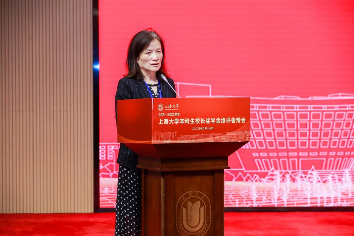 校党委常委、副校长聂清在会上做了讲话,她首先对获奖同学表示祝贺,并勉励同学们:第一,要坚定理想信念,谨记上海大学”严谨、勤奋、求实、创新“的学风精神,时刻明确自己的理想目标,并矢志不渝的向这个方向靠近,使优秀品质继续发扬下去。第二,要擦亮“上大底色”,牢记上海大学是一座红色学府。把自身同国家和人民联系在一起,保持浓厚的家国情怀,以小我融入大我,秉承“自强不息,道济天下”校训精神,坚持“先天下之忧而忧,后天下之乐而乐”的价值追求。第三,要追求卓越,学用济世。在未来求学求职的道路上要不断提升自己的能力,始终保持对事业的满腔热爱,勤于学习、善于学习、勇于创新、精益求精,做常为新的开拓者。能够以本心守正道,行稳致远,为人民、为国家、为世界做出更大的贡献。