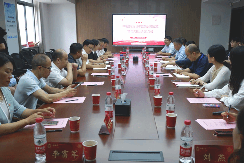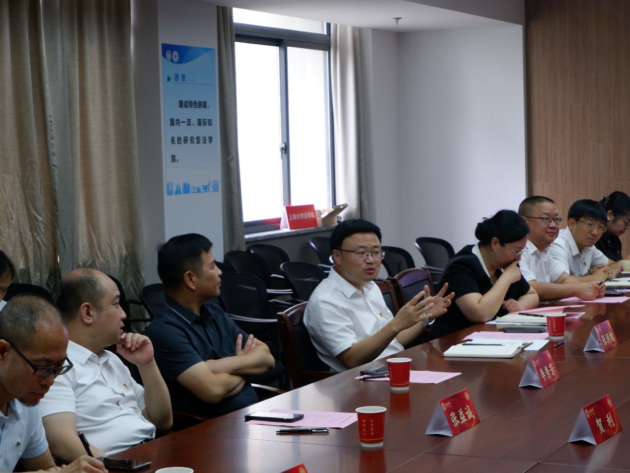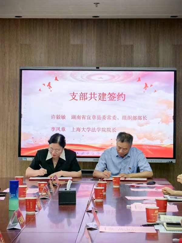 为了认真贯彻落实党的二十大精神,进一步继承邓中夏先烈的革命遗志,弘扬中夏精神,积极探索创新区域化党建新模式,2023年7月3日上午,法学院党委和湖南宜章县委共建中夏党支部签约仪式暨校地座谈交流会在上海大学宝山校区法学院304会议室顺利举行,校党委常委、组织人事部常务副部长、组织处处长沈艺,中共湖南宜章县委员会书记张润槐出席,法学院党委副书记、院长李凤章和宜章县委常委、县委组织部部长许毅敏代表双方签订共建协议。
