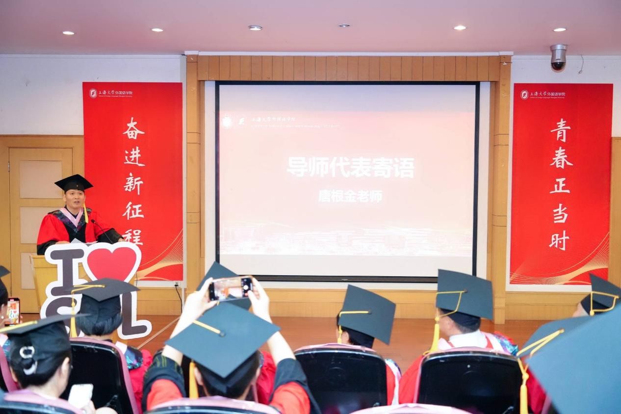 7月4日下午2点,上海大学外国语学院2023年毕业典礼暨学位授予仪式在宝山校区J103隆重举行。上海大学外国语学院党委书记吴蔚,党委副书记、院长尚新,党委副书记、副院长贾小琴,副院长戴朝晖、唐青叶、阚怀未,英语系主任张建琴,日语系主任赵莹波,教师代表邓志勇教授、李晓媛副教授、马拯副教授、唐根金副教授、朱音尔副教授、于梅欣博士、周萍博士、文雪博士以及2023届毕业生和2022届毕业生代表共同参加了本次毕业典礼。典礼由2023届毕业生章思怡、张开植主持。
