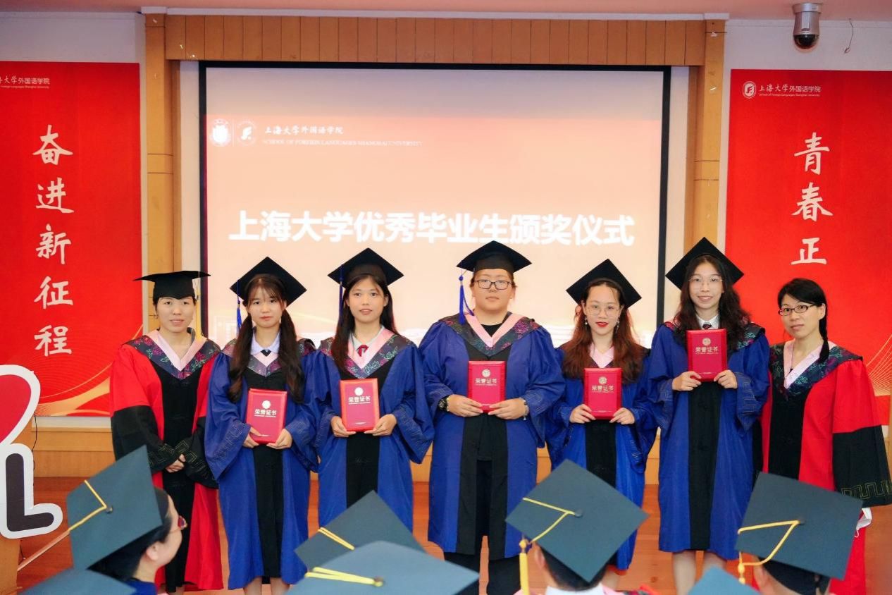 随后,英语系主任张建琴、日语系主任赵莹波为获得上海市优秀毕业生们荣誉称号的同学颁发证书;邓志勇、李晓媛、马拯、周萍为获得上海大学优秀毕业生同学们颁发证书。毕业生们从颁奖嘉宾手中接过的奖状,不仅是一份荣誉、辛勤学习的回报,更是承载了导师、学院、学校的殷切希望,希望他们谨记那份被褒奖的努力,在未来的道路上不忘初心,砥砺前行,向着更广阔的人生舞台接续奋斗。