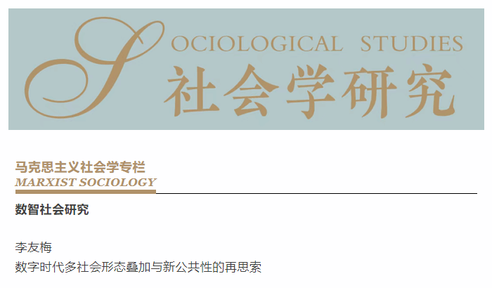 上海大学社会学院李友梅教授在《社会学研究》(2025年第5期)马克思主义社会学专栏发表《数字时代多社会形态叠加与新公共性的再思索》一文。李友梅教授长期从事社会协调机制、社会建设与基层社会组织、城市社会治理现代化等研究。该文是作者主持的国家社科基金重大项目“当代中国社会建设实践及其理论建构研究”的阶段性成果之一。