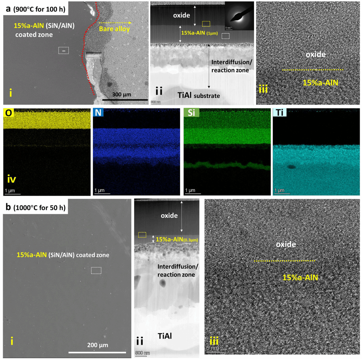 图3 15% a-AlN(a-Si₃N₄/a-AlN)涂层在钛铝合金上900°C或1000°C高温暴露后的微观结构