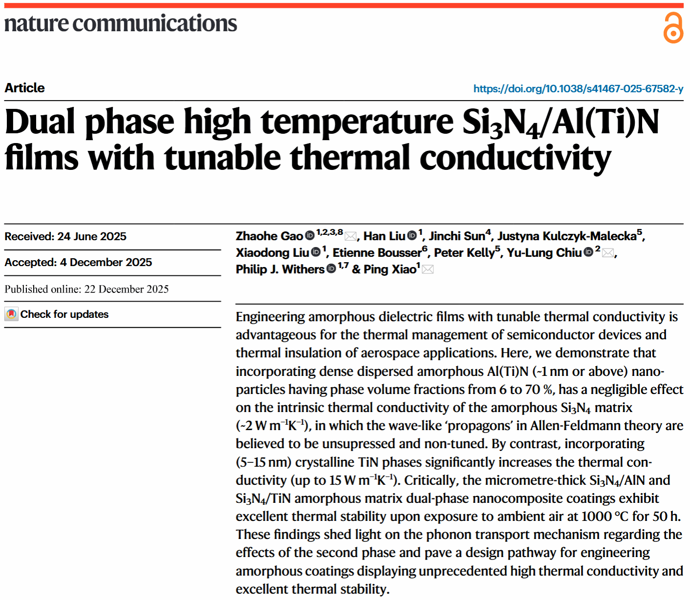 近日,上海大学材料基因组工程研究院/上海大学核电关键材料全国重点实验室高兆和副教授(张统一院士团队)联合英国曼彻斯特大学、英国国家材料实验室、伯明翰大学、美国伊利诺伊大学厄巴纳-香槟分校、加拿大蒙特利尔综合理工大学、英国曼彻斯特城市大学、考文垂大学、澳大利亚莫纳什大学等单位,在非晶Si₃N₄基体中引入致密、弥散分布的非晶Al(Ti)N纳米颗粒(尺寸约为1nm或以上、相体积分数为6–70%),在隔热涂层领域取得重要研究进展;在非晶Si₃N₄基体中引入晶体TiN纳米颗粒(5-15 nm,体积分数61-88%)可显著提升涂层热导率,适配高功率宽禁带半导体材料和器件等亟需高热导领域。相关成果以“Dual phase high temperature Si₃N₄/Al (Ti) N films with tunable thermal conductivity”为题,在线发表于国际顶级学术期刊《自然·通讯》(Nature Communications16:11555(2025))(影响因子:15.7)。上海大学材料基因组工程研究院高兆和副教授为第一作者和通讯作者,英国工程院涂层首席Ping Xiao教授和伯明翰大学电镜中心主任Yu-Lung Chiu教授为共同通讯,英国工程院院士和中国工程院外籍院士PhilipJ.Withers教授/爵士和磁控专家Peter Kelly教授也参与此工作。美国伊利诺伊大学厄巴纳-香槟分校‘MinimumThermal Conductivity’理论提出者David Cahill教授对此工作给了极大的帮助和指导。