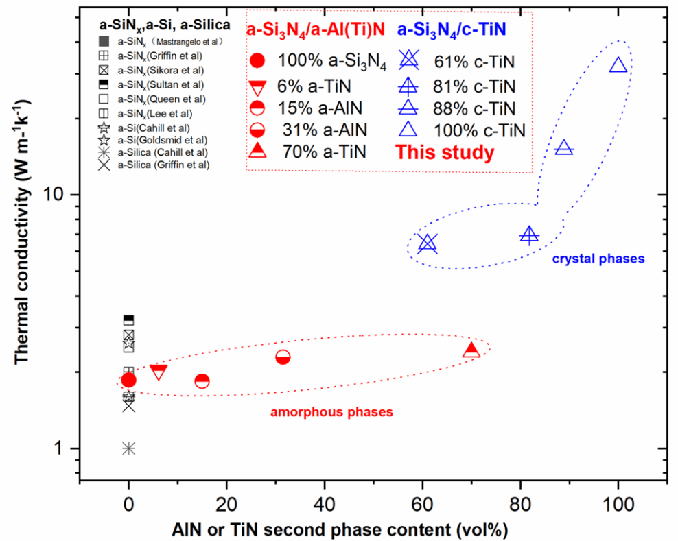 研究团队使用反应磁控溅射,通过精准调控沉积参数(如靶材功率、衬底温度、腔体分压等),制备由非晶Si₃N₄基体与非晶/结晶态AlN/TiN相构成的纳米复合氮化物涂层(图1),涂层整体致密,无孔隙和裂纹迹象。研究发现,引入非晶AlN或TiN纳米颗粒(体积分数6–70%),对非晶Si₃N₄基体的热导率(~2 W·m⁻¹·K⁻¹)影响甚微,表明非晶AlN或TiN第二相的存在,并未显著影响非晶薄膜中传播振动模式(传播子)对热导率的贡献,证明了Allen-Feldmann理论中wave-like“propagons”波形传导的不可被第二相抑制;相比较之下,引入晶态TiN纳米颗粒(体积分数61–88%)则能显著提升热导率,最高可达15.1 W·m⁻¹·K⁻¹,约为纯非晶Si₃N₄的8倍(图2)。