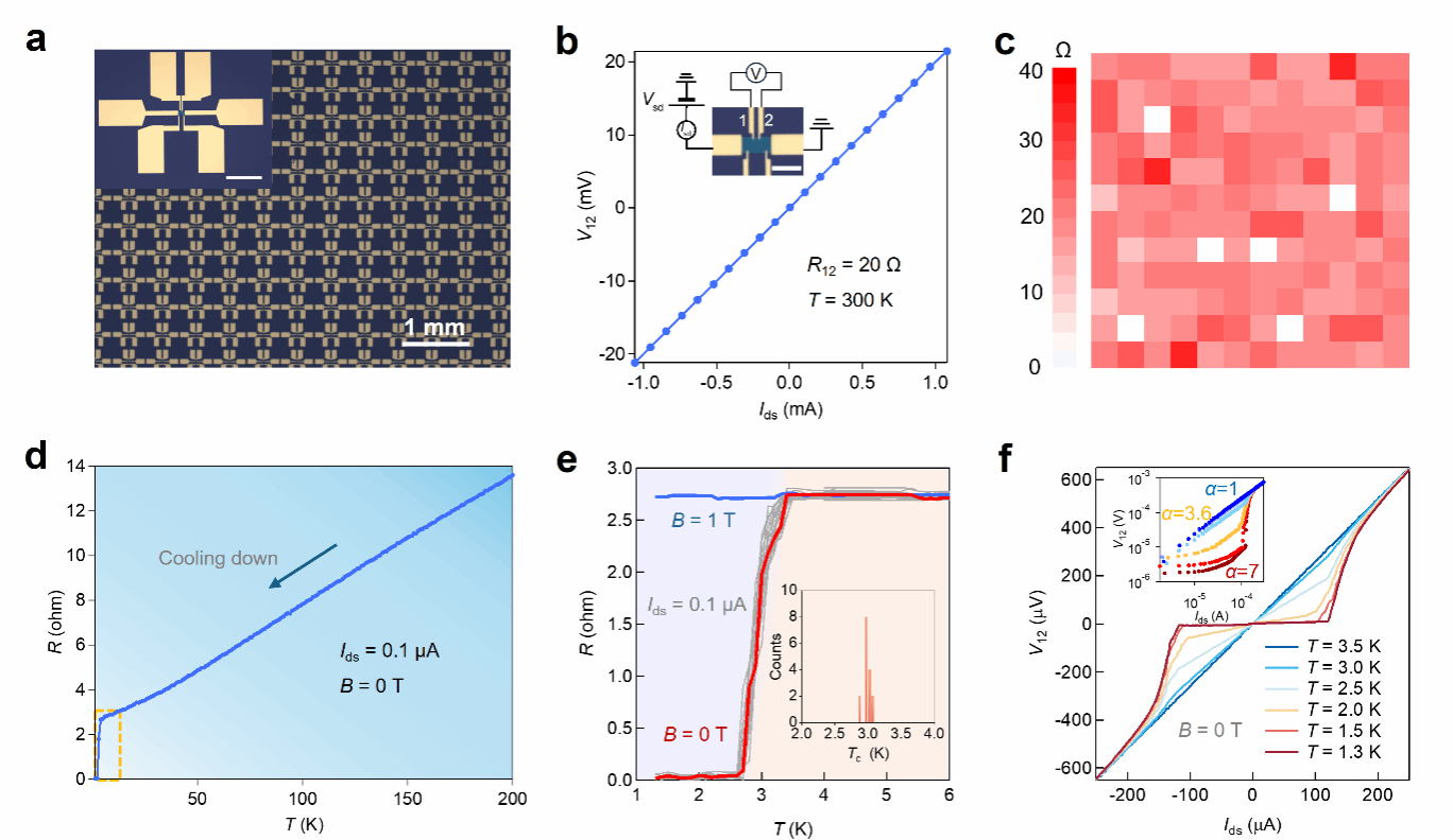 图4|晶圆级NbS₂薄膜的电学性能。a,将NbS₂薄膜转移至Si/SiO₂衬底后制备的多端器件阵列的光学显微图像。插图为单个多端器件的放大图。比例尺:100 μm。b,室温下NbS₂器件的四端电压–电流(V–I)特性曲线,对应电阻约为20 Ω。插图为四端测量示意图,其中V₁₂表示在探针1与2之间测得的电压,Vsd为源–漏电压,Isd为源–漏电流。比例尺:20 nm。c,(a)中所示1.2 × 0.9 cm²区域内共144个NbS₂器件的电阻(R₁₂)分布统计结果,测量温度为300 K。d,在零磁场条件下,NbS₂器件电阻(R₁₂)随温度变化的曲线,温度由200 K降至1.3 K。黄色虚线框标示了超导转变温度(Tc)附近的温区。e,在无磁场条件下(红色与灰色曲线)以及1 T磁场下(蓝色曲线),16个NbS₂器件从6 K冷却至1.3 K过程中的电阻变化。插图为16个NbS₂器件的Tc空间分布,显示其波动范围仅为±0.1 K,表明良好的器件一致性。f,无磁场条件下,不同温度(3.5 K至1.3 K)下NbS₂器件的四端V–I特性曲线。插图为(f)中V–I曲线的对数坐标重绘结果,显示V∝Iα的幂律行为,符合Berezinskii–Kosterlitz–Thouless(BKT)模型的预期特征,对应的幂指数α以相同颜色标注。