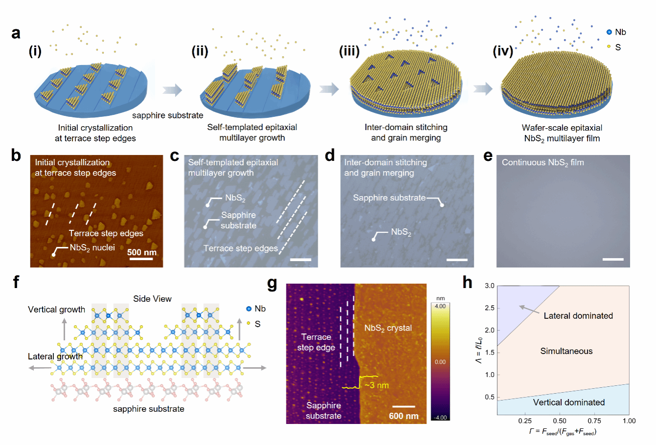 图1|基于金属有机化学气相沉积(MOCVD)的晶圆级NbS₂多层薄膜外延生长。a,NbS₂在2英寸c面蓝宝石上的四阶段外延生长过程示意图:(i)台阶边缘优先生核;(ii)自模板外延多层生长;(iii)畴并合与晶粒接合;(iv)连续外延薄膜的形成。b–e,与a中所示各生长阶段对应的原子力显微镜(AFM)及光学显微图像。(b)和(c)中的白色虚线表示蓝宝石衬底表面的原子台阶。c–e的比例尺均为30 μm。f,NbS₂自模板外延生长机制示意图。吸附原子既沿基面边缘方向生长(水平箭头),又在已有台阶表面生长(垂直箭头),从而实现横向扩展与纵向堆垛的同时进行。g,高分辨率AFM图像,显示受蓝宝石衬底原子台阶限制的单晶NbS₂畴。白色虚线表示蓝宝石衬底的原子台阶,正在生长NbS₂畴的高度约为3 nm。h,模拟计算得到的相图,展示随前驱体通量比Γ=Fseed/(Fgas+Fseed)与归一化表面扩散长度Λ=ℓ/L₀变化的生长区间。其中,Fseed表示来自旋涂NbCl₅层释放的初始Nb通量,Fgas为MOCVD过程中持续供给的气相前驱体通量,ℓ为吸附原子的表面扩散长度,L₀为初始晶核尺寸。