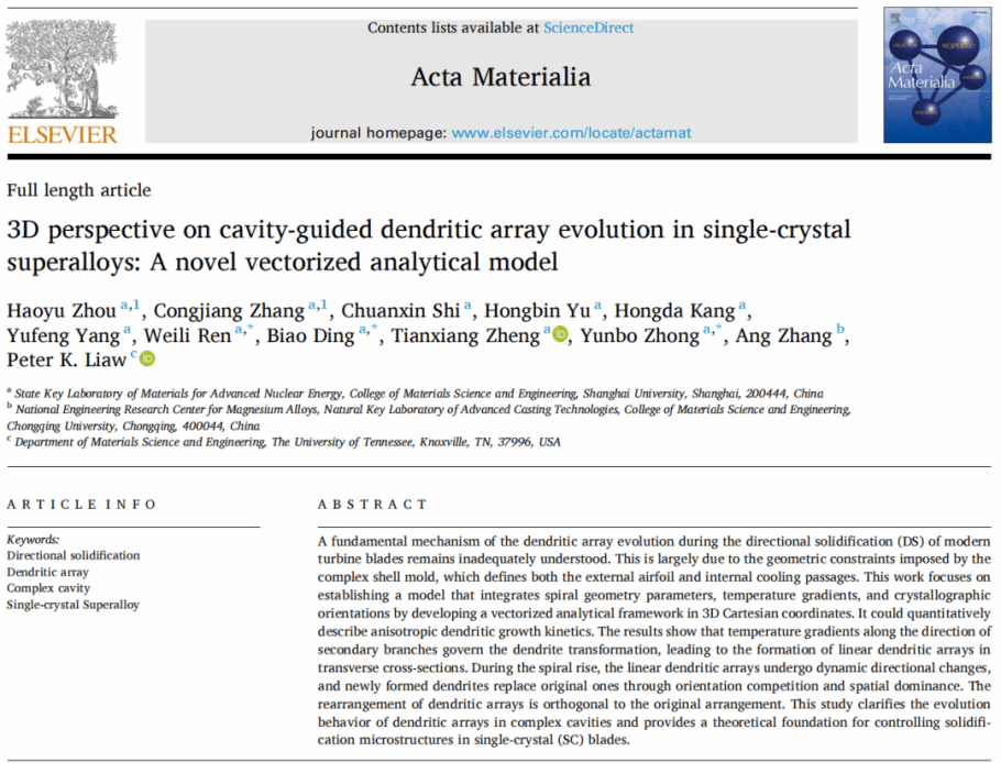 近日,上海大学核电关键材料全国重点实验室钟云波教授和任维丽教授领衔团队在镍基高温合金单晶叶片的定向凝固研究中发现,枝晶阵列的演化行为对单晶的生长和缺陷的形成起到决定性作用,并以三维矢量方法建立了全新的解析模型,相关结果以“3D perspective on cavity-guided dendritic array evolution in single-crystal superalloys: A novel vectorized analytical model” (图1)为标题在金属材料领域权威期刊《Acta Materialia》(影响因子9.3)上发表。上海大学为第一单位,硕士生周浩宇和博士生张丛江为论文共同第一作者,任维丽教授、丁彪副教授、钟云波教授为共同通讯作者,论文合作者还包括上海大学郑天祥教授、史传鑫、余洪斌、康宏达和杨煜锋博士生、重庆大学张昂教授、田纳西大学材料科学与工程学院Peter K. Liaw教授。