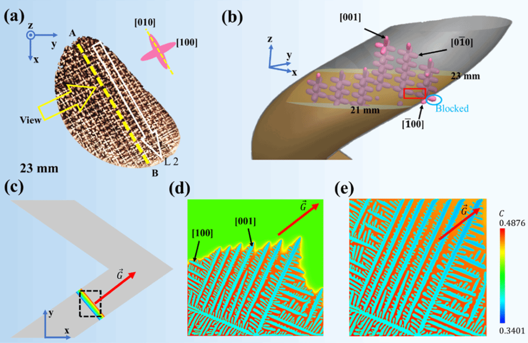 镍基单晶高温合金凭借其优异的高温力学性能和抗氧化腐蚀性能,成为航空航天和燃气轮核心热端部件涡轮叶片首选。定向排列枝晶阵列构成了叶片主体框架,很大程度上决定了其服役性能。随着航空发动机推重比和热效率的不断发展,单晶叶片结构越来越复杂,一方面内部结构表现为多层多通道多路的空心特点,另外一方面外部也呈现出渐变和多处突变截面特征,在单晶叶片的定向凝固过程中,复杂的型腔结构既约束热场、辐射与熔体流动,使得枝晶阵列也呈现复杂演变行为,同时也孕育了小角度晶界、杂晶、雀斑等缺陷形成。因此,枝晶阵列和型腔结构之间的关系构建已经成为生长高质量单晶叶片的关键科学问题,也是获得整齐排列枝晶必须突破的瓶颈。