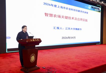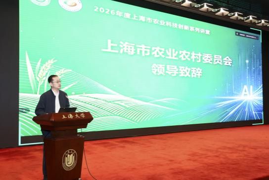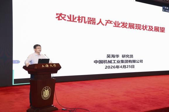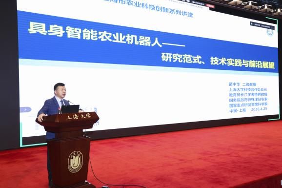 4月25日,2026年度上海市农业科技创新系列讲堂之人工智能赋能农业科技创新及产业发展专题活动,在上海大学宝山校区图书馆报告厅圆满举行。本次活动由上海市农业农村委员会指导,上海大学和上海市农业科技服务中心主办,汇聚政、产、学、研、用多方代表,聚焦AI技术与都市现代农业深度融合,共探科技创新与产业创新协同发展路径,助力农业机器人新质生产力加速落地上海。上海市农业农村委党组成员、副主任张秩通,上海大学党委副书记、副校长胡大伟出席并致辞,上海市农业科技服务中心主任沈悦、上海市农业农村委员会种植业处处长张瑞明、上海市农业技术推广服务中心主任王广鹏、上海市宝山区农委主任王健惠、上海交通大学教授刘成良、上海大学机电工程与自动化学院党委书记郭纯生等领导出席会议。