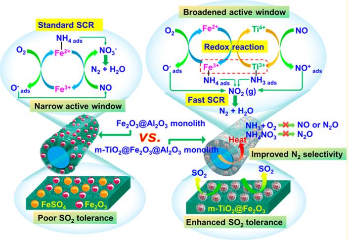 为了实现SCR催化剂的过程强化与低温抗硫性能的有机统一,该团队利用蒸汽氧化以及钛酸酯偶联剂辅助一步自组装法制备了“TiO2@Fe2O3@Al2O3”金属铝基整体式催化剂。该催化剂具有优异脱硝性能的同时,并且在260 oC具有良好的抗硫稳定性。结果表明Fe2O3(核)-TiO2(壳)界面的电子转移加速了氧化还原循环,引发了“快速SCR”反应,拓宽了低温窗口。介孔TiO2壳层对SO2吸附较弱,有效抑制了FeSO4和NH4HSO4的沉积,并促进了NH4HSO4的分解。本工作首次提出了Fe2O3@TiO2核壳结构的低温抗硫机制,为开发低温耐硫SCR催化剂提供了新策略,增深了对低温抗硫脱硝机理的认识,为实现催化剂的实际应用起到促进作用。该团队博士后韩璐蓬为第一作者,张登松研究员为文章的通讯作者。文章链接:https://pubs.acs.org/doi/10.1021/acs.est.9b00435