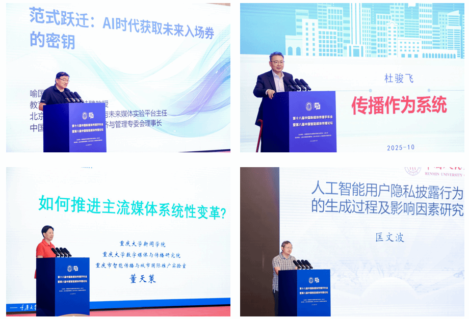 主旨论坛上,来自同行高校、相关领域企业的专家学者围绕如何推进主流媒体系统性变革、智能传播范式与生态变迁、人工智能隐私与信任问题等展开演讲,上海大学新闻传播学院吴信训教授、周宇豪教授担纲主持。